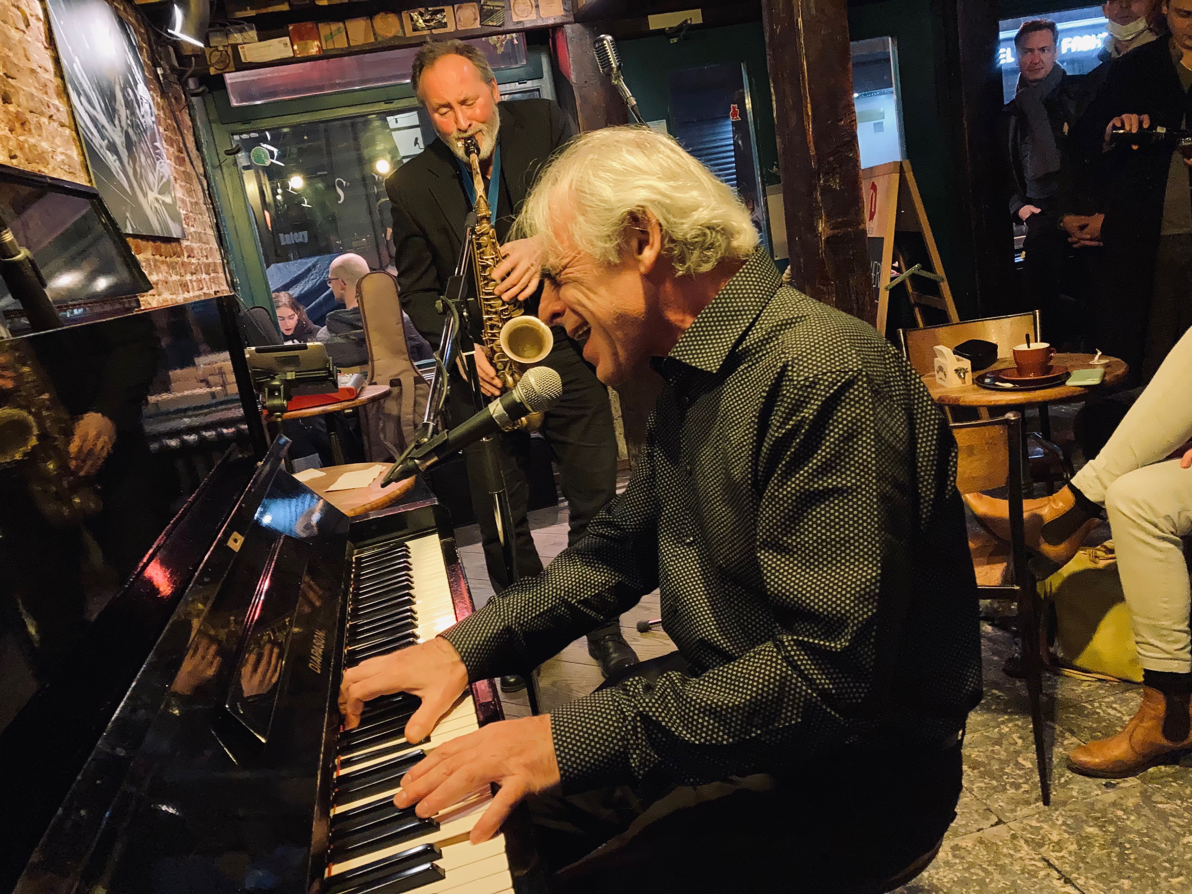 Session de jam blues animée par Tom Beardslee au Café Bizon à Bruxelles, réunissant musiciens pour des performances improvisées en live dans une ambiance conviviale.