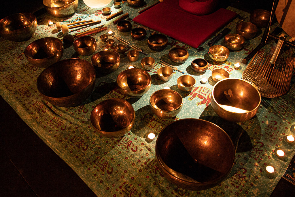 Concert méditatif avec une vingtaine de bols tibétains, gongs et autres instruments ancestraux, accompagné de lumières et huiles essentielles pour une expérience sonore immersive.