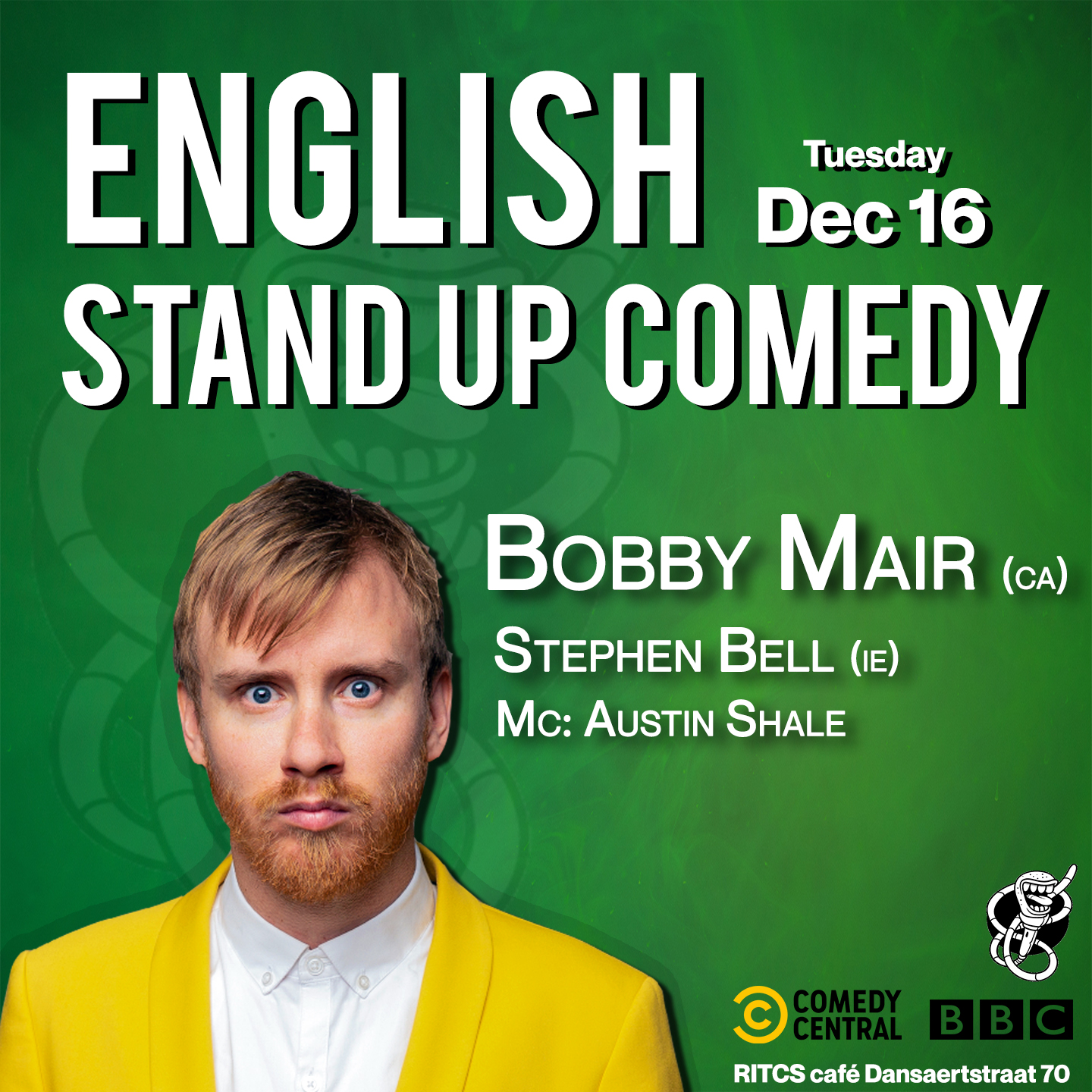Soirée stand-up en anglais au RITCS café à Bruxelles avec les humoristes Bobby Mair et Stephen Bell. Spectacle d'humour en live à 20h.